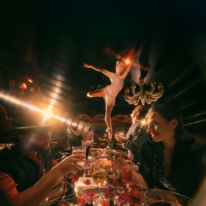 A host glides and honks his way through the main dining room on a Vespa, threading through cloth-covered tables before joining fellow dancers on stage. Soon after, a ballerina balances atop a row of rotating Champagne bottles with studied calm. And an aerialist, suspended by her ponytail, hovers above as the famed Bellagio fountains surge and retreat on cue in the background.