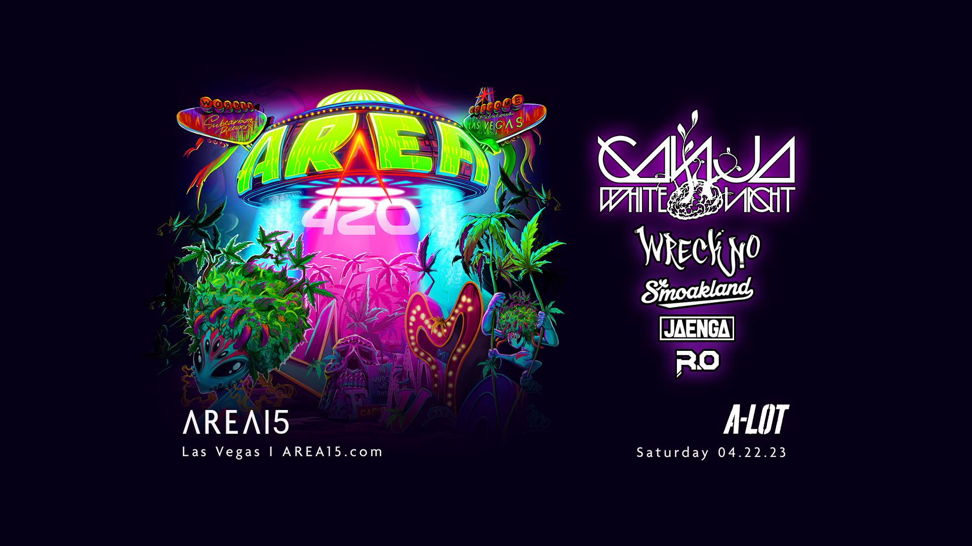 Spend 420 weekend with Ganja White Night and special guests as they take over the open-air A-Lot for AREA420, their first event of 2023! You’re invited to hit the dance floor for a night of dark, wobbly futuristic bass and dubstep beats provided by Ganja White Night, Wreckno, Smoakland, Jaenga, and R.O., happening only at AREA15 on Saturday, April 22. Events in Las Vegas get canceled every now and then. It doesn’t hurt checking with the venue to confirm the listing. Explore even more of what the Las Vegas Strip has to offer with the Vegas2Go app. It’s your ultimate guide to eat, play, shop and party across Las Vegas. Vegas2Go is now available as a free download in Apple’s App Store and in the Google Play Store.