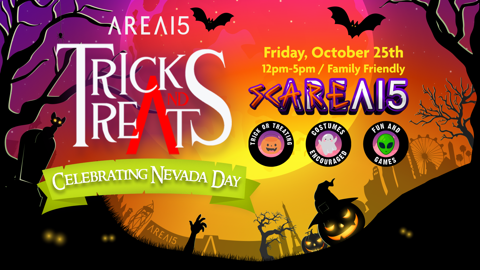 Get ready for a spooktacular time at AREA15’s Tricks and Treats event! Join us for some entertainment, mysterious magic, and delicious delights. Don’t miss out on the fun, it will be a Halloween celebration like no other! Families are invited to celebrate Nevada Day and kick off Halloween Weekend with Trick AND Treating throughout AREA15 and participating outlets.