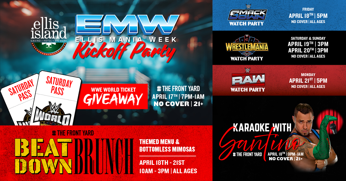 Make Ellis Island your home for Mania Week! Secure your spots today! Fan Welcome Party - April 17 - 7PM-1AM Kick off Ellis Mania Week in The Front Yard with trivia & live DJ! Beat Down Brunch - April 18-21 - 10AM-3PM Mania Week Friday through Monday: food & drink specials, themed menu, and catch all the action live! Smackdown Watch Party - April 18 - 5PM-8PM Watch Smackdown on the big screen! Karaoke with Santino Marella - April 18 - 9PM-1AM One Night Only: WWE legend Santino Marella hosts karaoke in The Front Yard! NXT Stand & Deliver Watch Party - April 19 - 9AM-2:30PM Join Ellis Island on Saturday morning for Beat Down Brunch and catch NXT Stand & Deliver live! Wrestlemania Watch Party - April 19-20 - 3PM-8PM Watch the action on the 18ft big screen on Saturday & Sunday! RAW Watch Party - April 21 - 5PM-8PM Join Ellis Island on Monday night for RAW on the big screen! Click here for more info