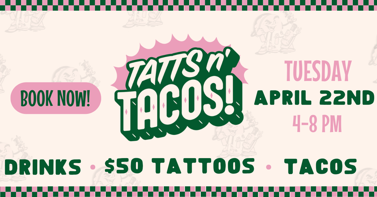 Mark your calendars! Tuesday, April 22nd, from 4 PM to 8 PM, we're bringing you a night to remember: Tatts n Tacos! For just $50, dive into our flash tattoo event where you'll score a fresh piece of ink, savor two delicious tacos (on us!), and sip on a handcrafted cocktail. Come experience the perfect Tuesday night vibe with us. We can't wait to see you there! Click here for more info