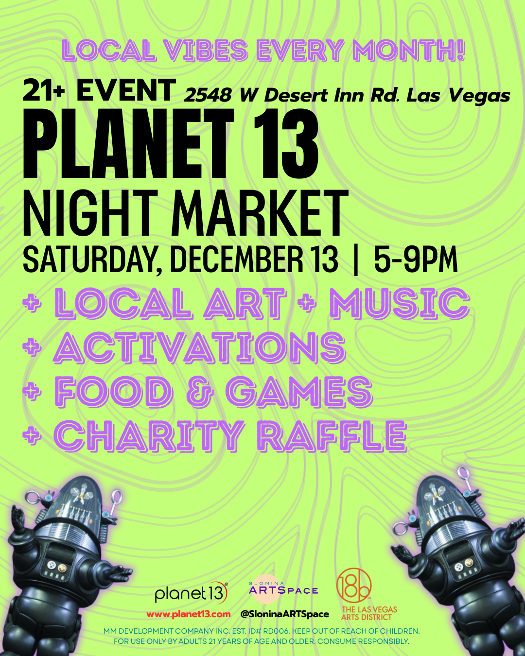 Las Vegas' most unique monthly indoor market is back for the holidays at Planet 13, celebrating local creativity with one-of-a-kind art featuring Las Vegas area artists and craftspeople with live music and food trucks. This month's December Charity Raffle will benefit 18b The Las Vegas Arts District Neighborhood Association. This event is committed to building a stronger and more connected downtown community and to help keep art in the Arts District.