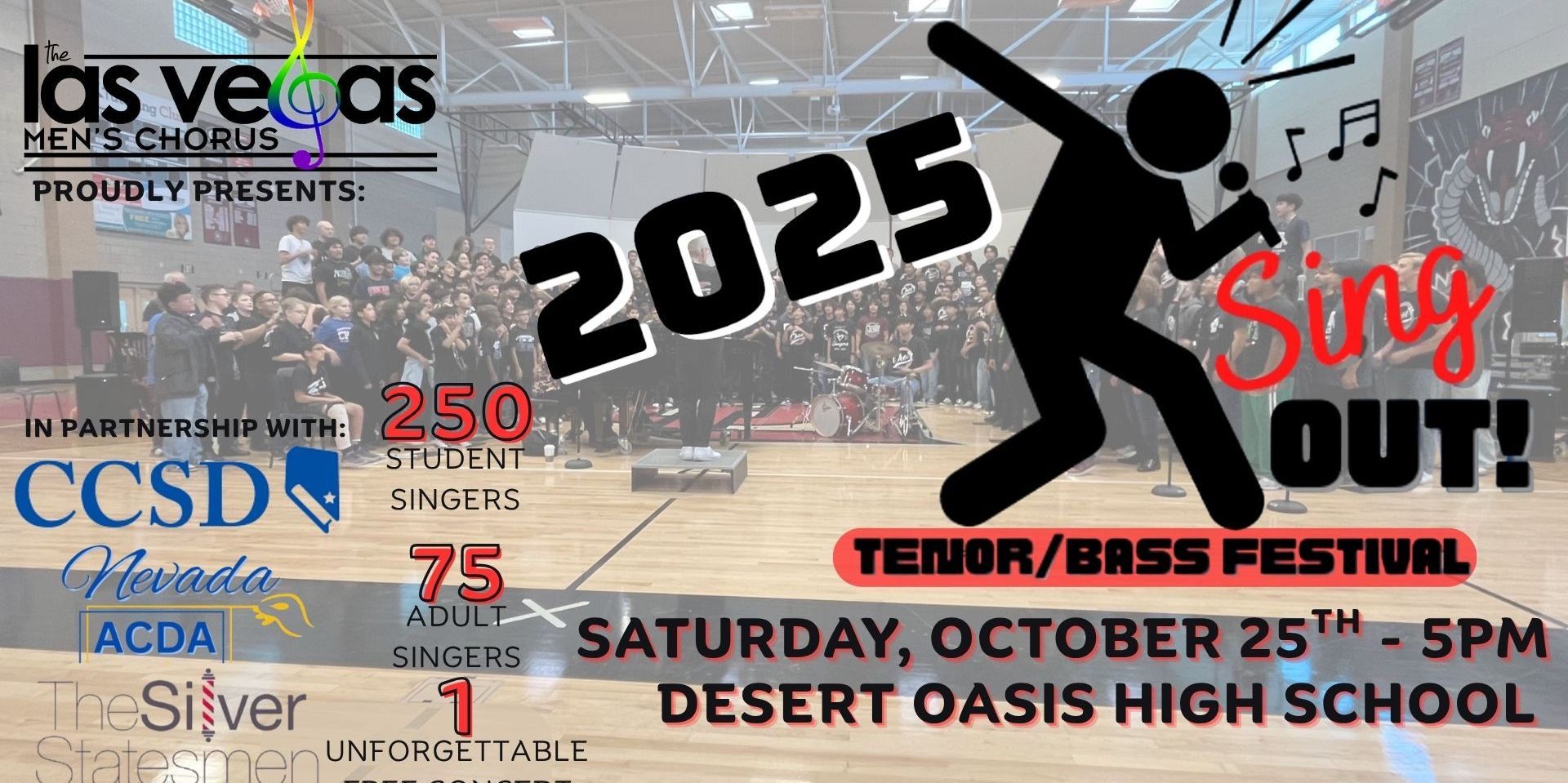 Join the LVMC for a FREE Community Concert Series in partnership with the Clark County School District, Nevada ACDA, and The Silver Statesmen! “Sing Out! A Tenor/Bass Festival” is a choral showcase featuring hundreds of tenor/bass singers from CCSD middle schools, high schools, and surrounding areas. This one-day event intended to bolster confidence and lifelong love of singing in our community's young people culminates in a joint concert with the Las Vegas Men’s Chorus and The Silver Statesmen: 250 student singers and 75 adult singers! LVMC is proud to financially underwrite this event, ensuring the concert is FREE and open to all.