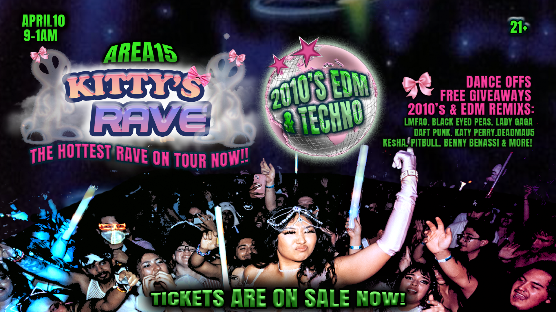 Party with Kitty’s Rave at AREA15! Lose yourself in a world of neon lights, electrifying beats, and the purrfect vibes as you dance the night away. Join us for a wild experience that will leave you feline fine.