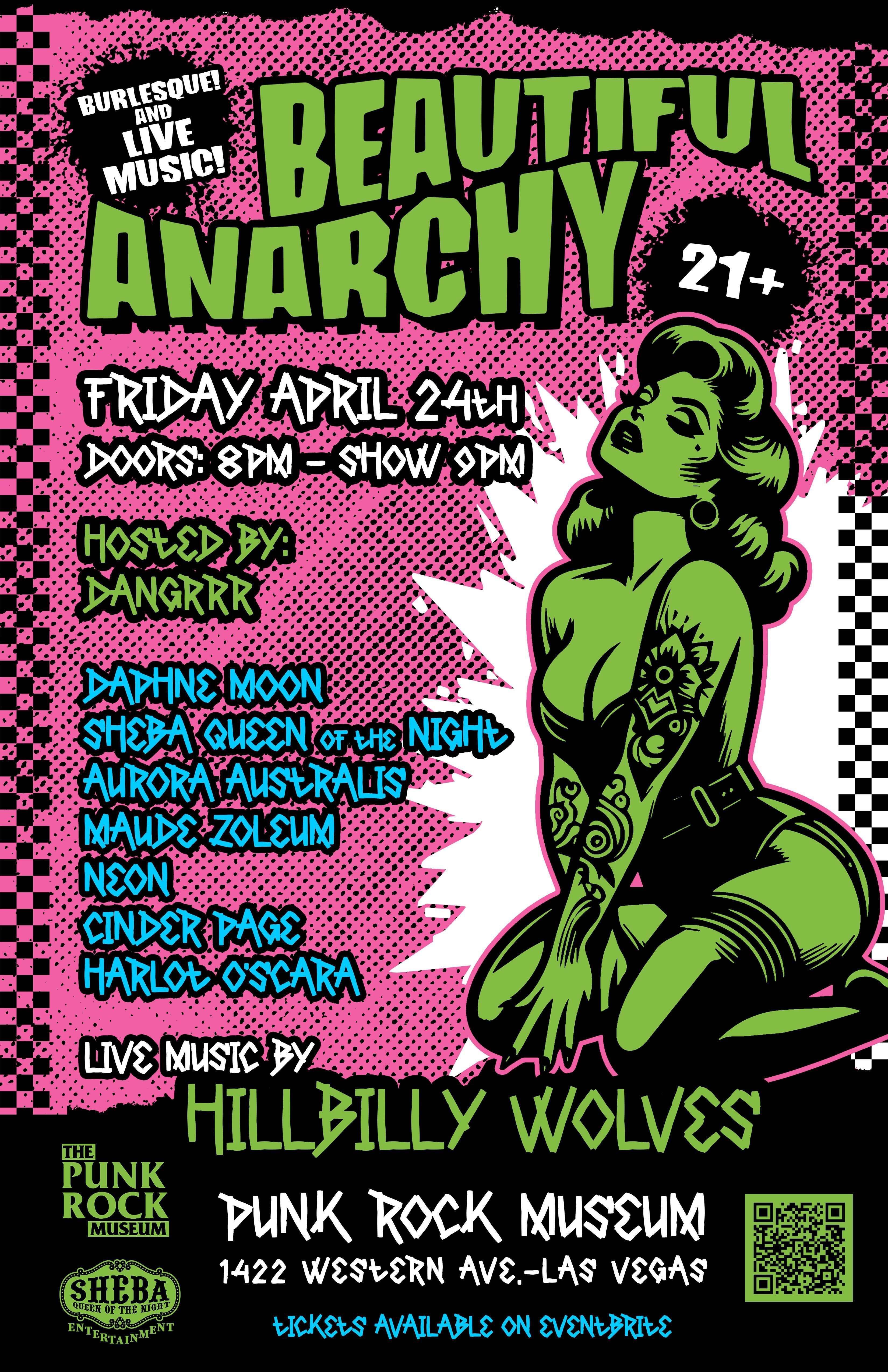 Get ready for Beautiful Anarchy! We are back at the Punk Rock Museum on Friday, April 24th with live music and burlesque! Hosted by Dangrrr, performances by Aurora Austraulis! Maude Zoleum! Sheba Queen of the Night! Neon! Cinder Page! & Daphne Moon! And Hillbilly Wolves will be our musical guest! Come rock out with us and get your tickets online now. Click HERE for tickets.