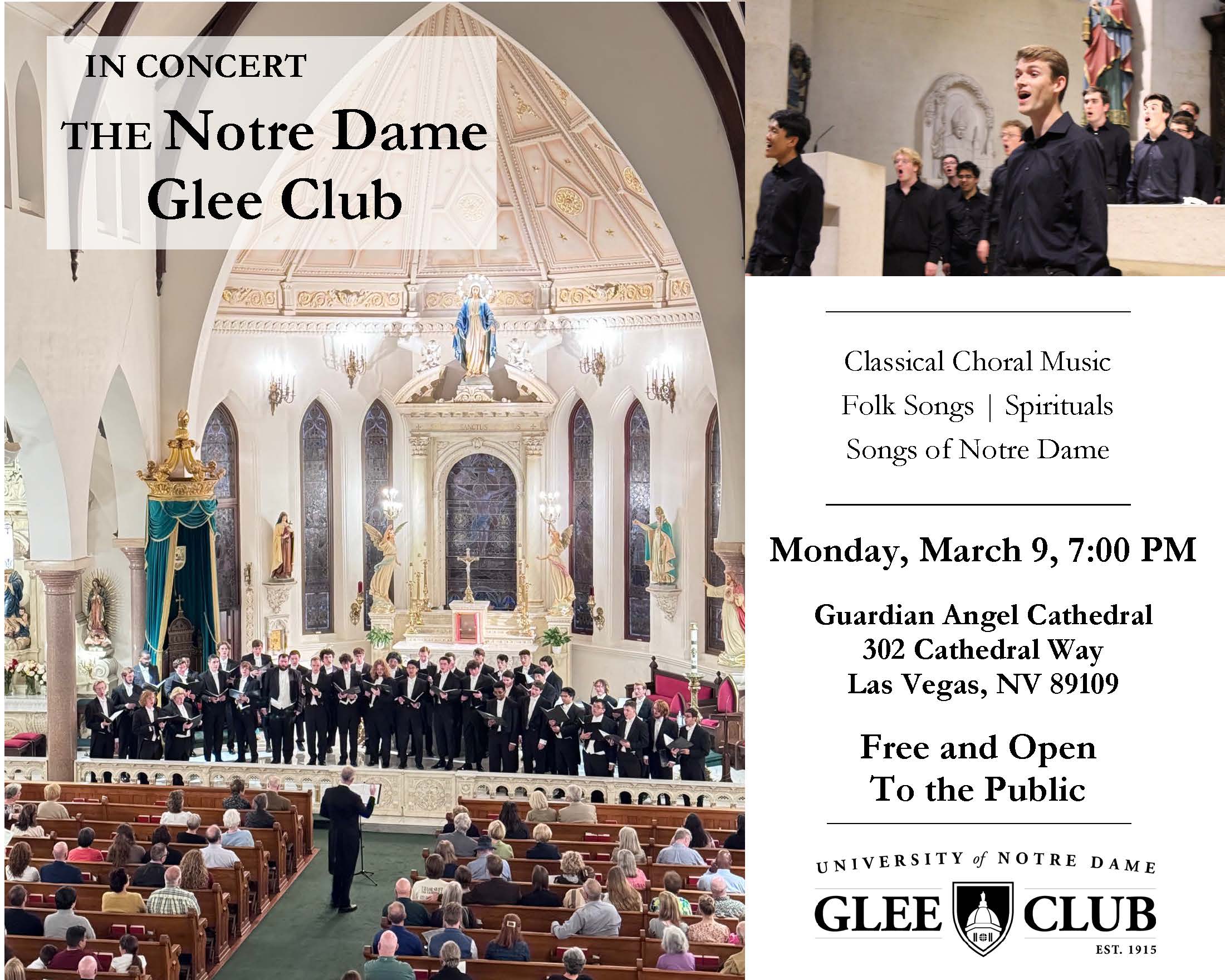 The Notre Dame Glee Club presents a wide-ranging repertory each year in several formal campus concerts and on tour, as well as in dozens of informal performances at University events. The Club’s membership is drawn from all courses of study at the university; their concert programs customarily include classical a cappella music for men’s chorus as well as folk songs, spirituals, pop, barbershop arrangements, and songs of Notre Dame. The Club tours domestically twice each year, and internationally once every other year; over the last quarter-century they have performed in over 45 U.S. states and in 20 countries in Europe, Asia, and Latin America. Among several available Glee Club recordings is Christmas at Notre Dame with the Notre Dame Symphony Orchestra. Guardian Angel Cathedral is the Metropolitan Cathedral for the Roman Catholic Archdiocese of Las Vegas. With over seven seconds of natural reverb and decay, it is known as the most vibrant space in Las Vegas bringing choral music to life.