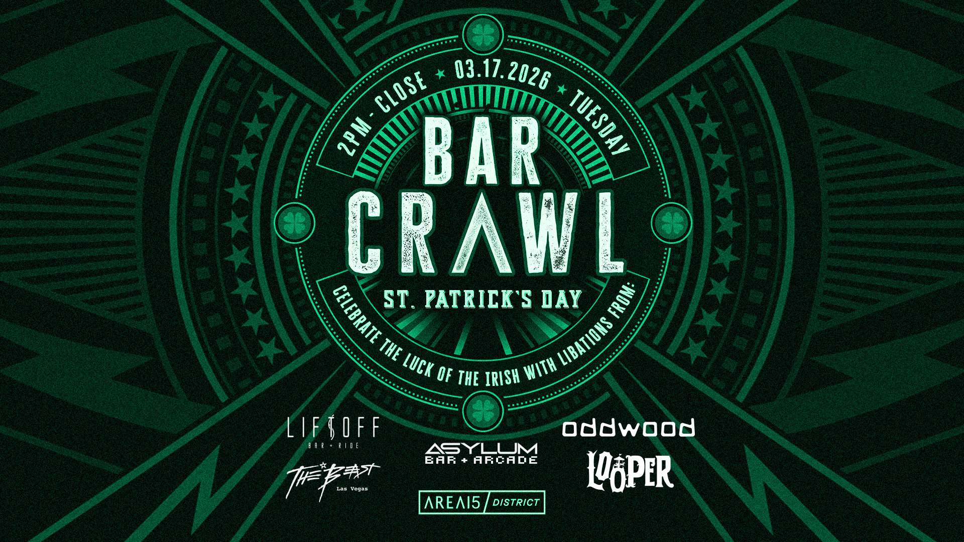Celebrate St. Patrick’s Day the AREA15 way with a self-guided bar crawl built for roaming, sipping, and discovering at your own pace. Sip beneath the massive glowing maple tree at Oddwood, where the luminous ambience meets elevated mixology. Take in the bold, high-energy atmosphere at The Beast, known for big flavors and vibrant vibes, then level up at Asylum Arcade with retro games and a festive pour. Feel the thrill at Looper Bar and take things skyward at LIFTOFF Bar and Ride, where themed drinks pair with a literal lift and sweeping skyline views in the open desert air. With surprise activations popping up throughout the day, each stop brings a little extra luck. Grab your crew, follow the energy, and start your crawl.