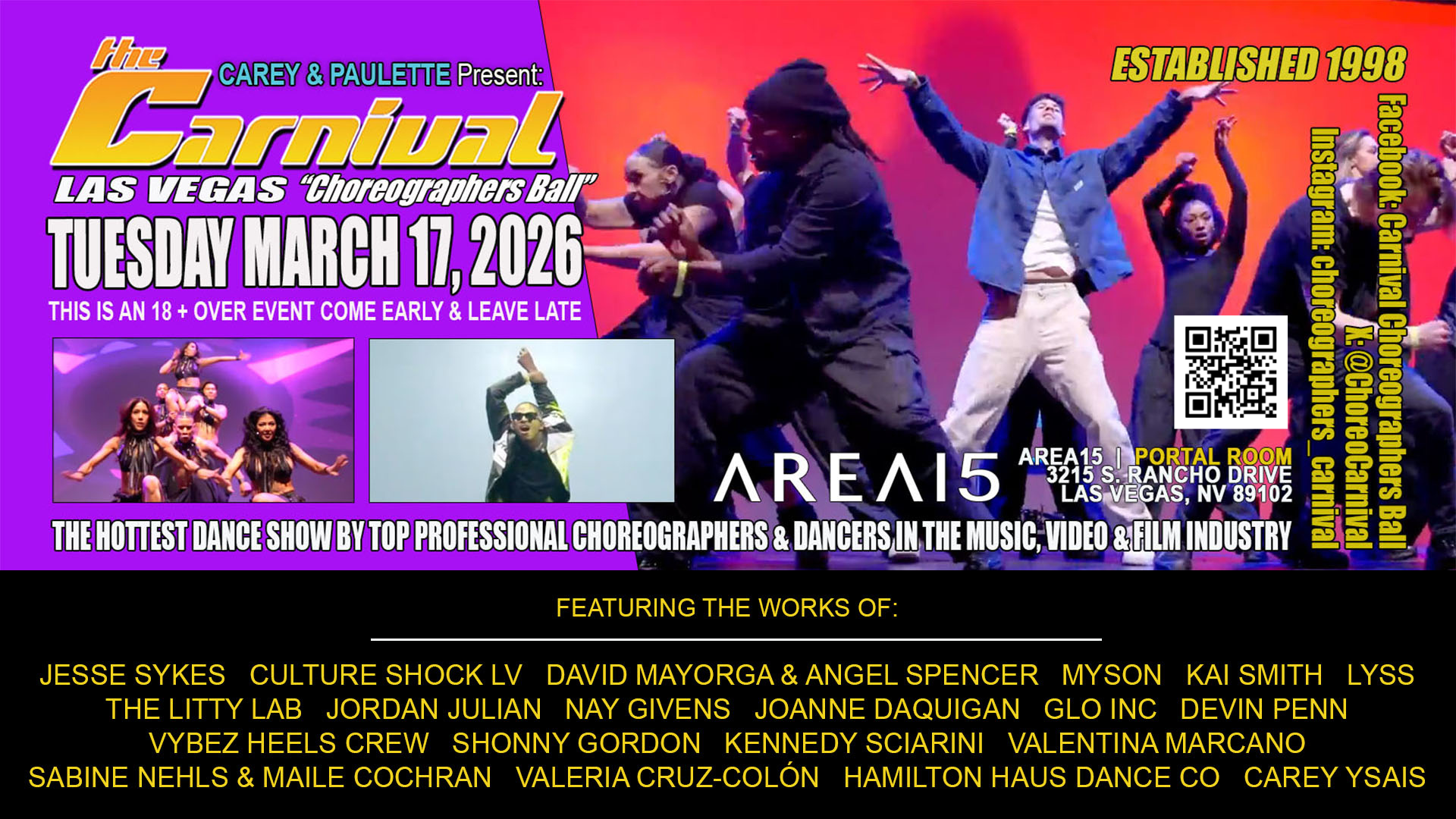 Welcome to The Choreographer's Carnival LAS VEGAS! Get ready for a night filled with jaw-dropping dance performances and incredible choreography. Join us Tuesday March 17, 2026 at AREA15 PORTAL ROOM for an unforgettable experience. Don't miss out on this opportunity to witness some of the most talented dancers in the industry flaunt their skills. Grab your friends and come dance the night away with us!