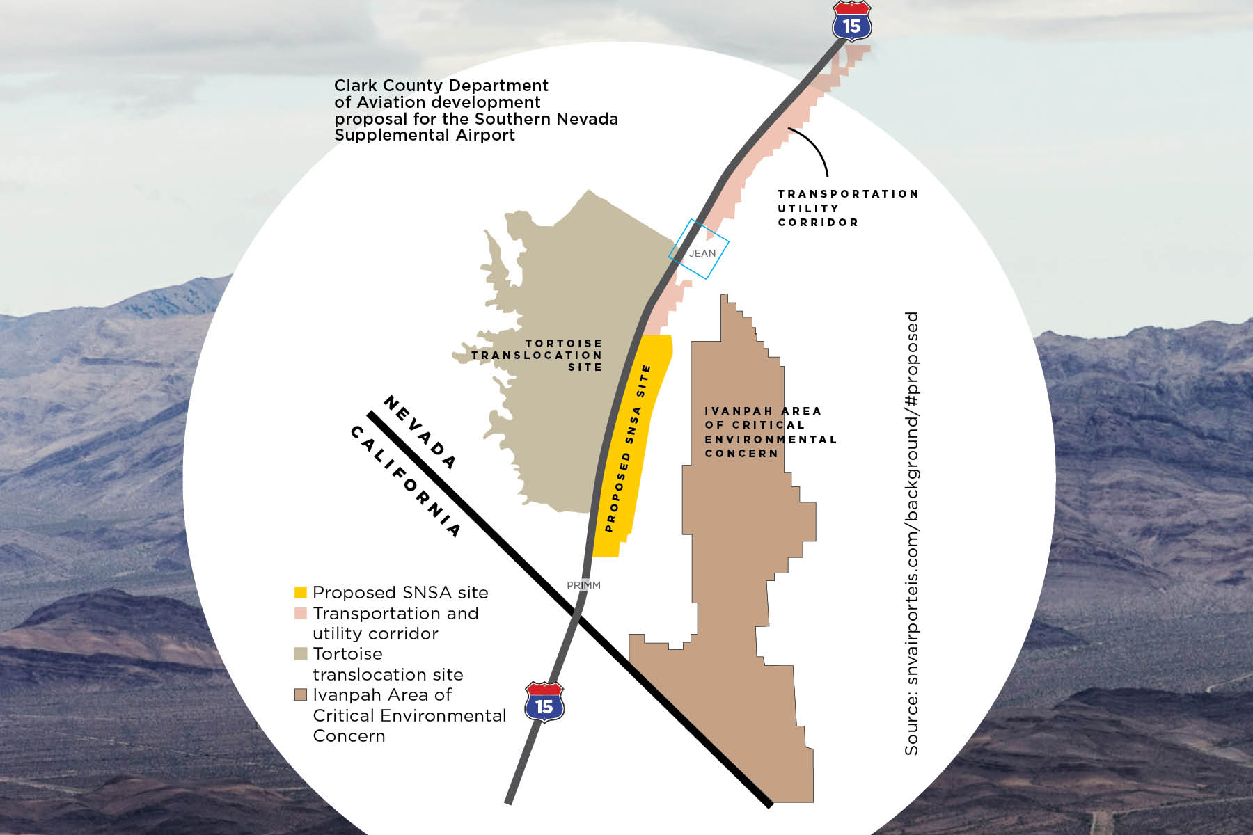 Former county and airport officials foresaw this possibility as early as 2000, when they successfully lobbied the United States Congress to pass the Ivanpah Valley Airport Public Lands Transfer Act. The legislation granted the county roughly 6,000 acres in the area for the eventual development of a supplemental commercial airport, but the plot sat vacant while the idea was revisited and shelved multiple times over the years.