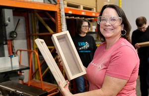 “This is the class that has sent people to urgent care, so you have to be careful,” she tells a group of students before walking them through the process of carving out space to add hinges to their hardwood boxes.